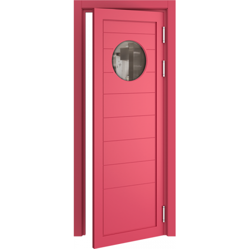 Барные двери актуальны в помещениях с повышенной проходимостью для более удобного доступа персонала к техническим комнатам, например с бара в зону кухни. Часто бывает необходимым, для обзора соседнего помещения, чтобы дверь была остекленная и стилистически оформлена. Стекло толщиной 4 мм круглой, овальной или квадратной формы, на выбор: сатинат светлый, бронзовый, графит или прозрачное стекло. Устанавливается на двери толщиной 40 мм в покрытии Эмаль (любой цвет по каталогу RAL Classic K7) и толщиной 35 мм в ПВХ-покрытиях.